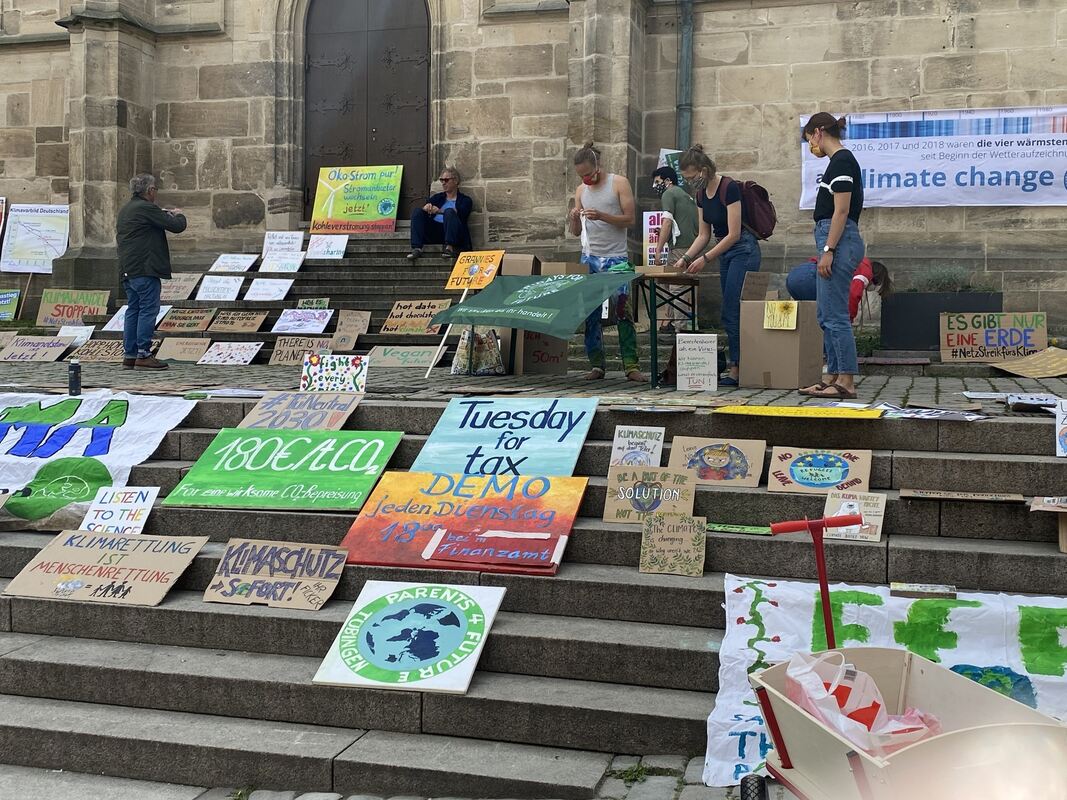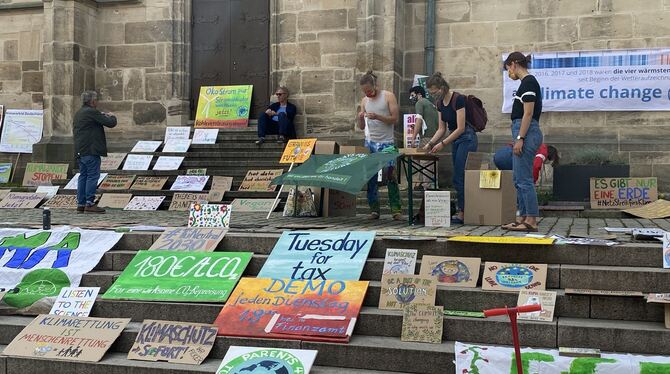 Auch in Tübingen wollen die Aktivisten von Fridays for Future trotz Corona auf die Klimakrise aufmerksam machen. Deshalb organsierten die Tübinger Ortsgruppe für den heutigen globalen Klimastreik eine Demo ohne Menschen, aber mit Plakaten auf dem Holzmarkt. Wer mitmachen wollte, konnte sein Plakat im Vorfeld beim Unverpacktladen Speicher abgeben. Dabei sind zahlreiche Schilder mit Klimaforderungen zusammengekommen, die auf den Stufen hoch zur Stiftskirche aufgestellt wurden. Vor dem Brunnen platzierten die Anhänger von Parents for Future Steine, die sie ebenfalls mit Klimaforderungen beschriftet hatten. Auch dieser stille Protest ist Teil des weltweiten Klimastreiks. (sapo)