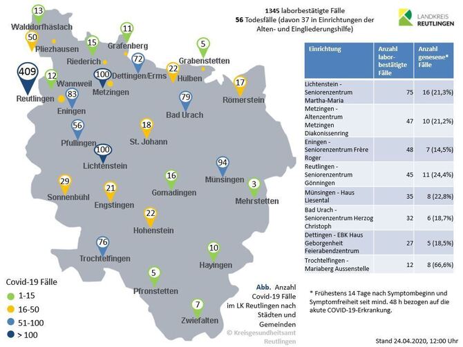 16:43 Uhr Im Kreis Reutlingen gibt es 1.333 laborbestätigte Corona-Fälle. Das sind 21 mehr als gestern bekannt waren. Demgegenüber stehen 802 Genesene. Im Zusammenhang mit Covid-19 sind 55 Menschen gestorben, Stand gestern gab es 51 Todesfälle. Insgesamt wurden 10.274 Abstriche gemacht, begründete Verdachtsfälle gab es 3.725. (pm)