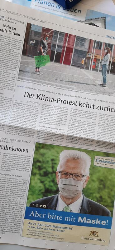 13:02 Uhr Die Aktivisten von Fridays For Future (FFF) in Tübingen kämpfen trotz Corona weiter für das Klima. Für den globalen Klimastreik am Freitag, 24. April, haben sie eine stumme Demonstration geplant. Dabei werden auf dem Holzmarkt Plakate aufgestellt, menschliche Demonstranten werden nicht dabei sein. Wer mitmachen möchte, kann sein Plakat beim Unverpacktladen Speicher in der Tübinger Altstadt abgeben. Gleichzeitig läuft über YouTube ein Demoprogramm, das FFF-Gruppen aus ganz Deutschland zusammen geplant haben. (sapo)