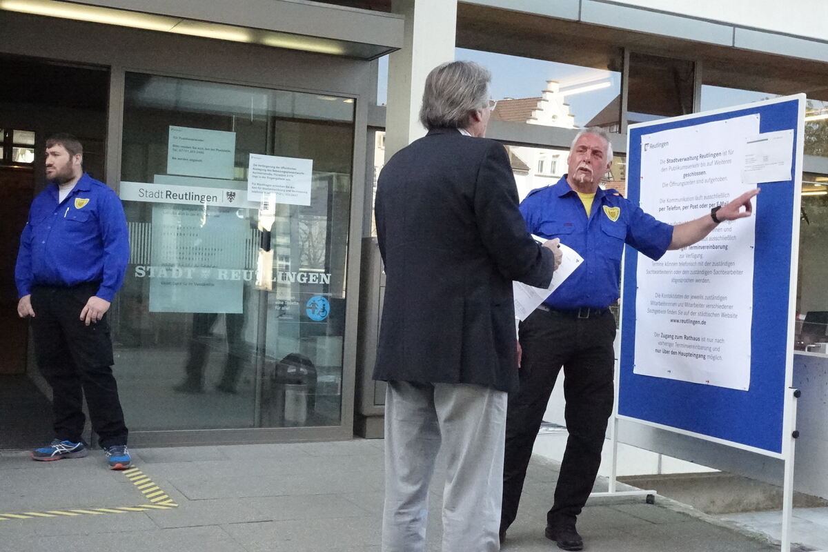 18:04 Uhr Ohne Code kein Einlass: Hans Ott und Mitarbeiter seiner Betzinger Sicherheitsfirma kontrollieren den Zugang zum Reutlinger Rathaus. Zwei stehen am Haupteingang, einer im Foyer. Ein vierter bewacht den Hintereingang. Am 20. April startete der geregelte Grundbetrieb im Rathaus mit geänderten Öffnungszeiten. Voraussetzung für den Zutritt zum Rathaus ist jetzt ein vorab telefonisch vereinbarter Termin mit dem jeweiligen Amt, bei dem es auch einen Code gibt. Ohne diesen Code kommt kein Rathausbesucher an Hans Ott und seinen Kollegen vorbei. (ass)
