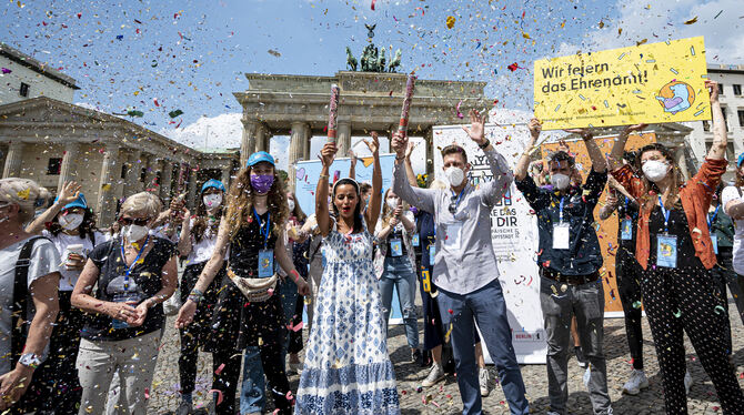 13:20 Uhr Mit einer ungewöhnlichen Aktion am Brandenburger Tor haben Vertreter von Freiwilligenagenturen und der Berliner Senat auf die Bedeutung ehrenamtlichen Engagements für die Gesellschaft hingewiesen. Auf den Pariser Platz ließen sie am Samstag einen bunten Konfettiregen niederprasseln. Die Aktion ist Teil einer Kampagne, mit der der Einsatz ehrenamtlich engagierter Menschen in der Stadt bekannter gemacht werden soll. Unter dem Hashtag #freiwilliginBerlin werden dazu in sozialen Medien Videos gepostet. "Jede dritte Berlinerin, jeder dritte Berliner engagiert sich freiwillig", sagte die Staatssekretärin für bürgerschaftliches Engagement, Sawsan Chebli, der Deutschen Presse-Agentur. " Viele setzten sich dafür ein, dass andere nicht auf der Strecke blieben. Während der Pandemie seien sie sofort zur Stelle gewesen, als es darum gegangen sei, anzupacken und nachbarschaftliches Engagement in der Corona-Krise zu unterstützen. Aktuell koordinierten sie etwa die Ausgabe von Corona-Schnelltests an kleine Organisationen und Initiativen, erläuterte die Staatssekretärin. (dpa)