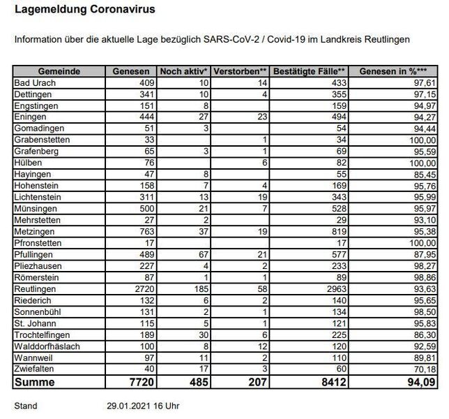 17:59 Uhr Das Reutlinger Landratsamt meldet für Sonntag 8.454 bestätigte Corona-Fälle im Landkreis Reutlingen seit Beginn der Pandemie, das ist eine mehr als gestern. Die 7-Tages-Inzidenz pro 100 000 Einwohner im Kreis Reutlingen beträgt nach Angaben des Landesgesundheitsamts 71,1. (pm)