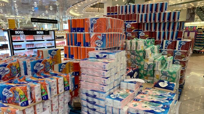 15:29 Uhr In der Reutlinger Innenstadt waren heute um die Mittagszeit ungewöhnlich viele Menschen zu beobachten, die etwas unter dem Arm trugen, das derzeit in den meisten Supermärkten als Mangelware gilt: Toilettenpapier. Vor ein paar Wochen hätte das niemanden interessiert, heute schon. Vereinzelt blieben Passanten stehen, drehten sich um, tuschelten. »Schau mal, die haben noch was bekommen«, sagte eine junge Frau zu ihrer Freundin. Wer in die Richtung läuft, aus der die stolzen Klopapier-Träger kommen, findet schnell ihre Quelle. Ein riesiger Toilettenpapier-Haufen im Verkaufsraum eines Drogeriemarkts. Wann der wohl abverkauft ist? (ege)