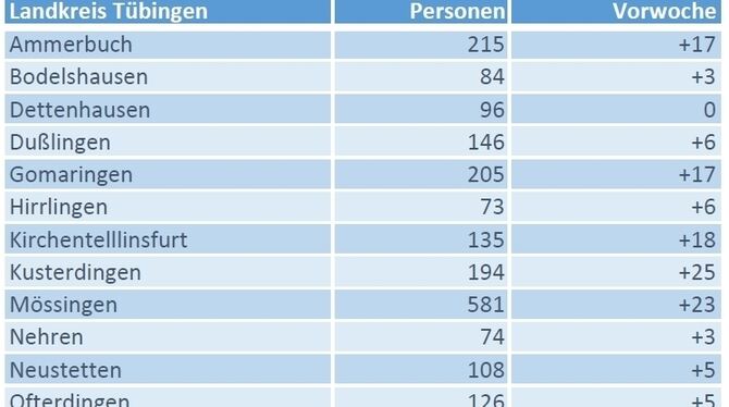 Fallzahlen auf Städte und Gemeinden im Kreis Tübingen verteilt
