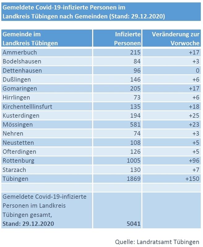 18:02 Uhr Dem Landratsamt Tübingen sind am Mittwoch 68 Neuinfektionen mit dem Coronavirus gemeldet worden. Damit liegt der Kreis bei 5.109 Fällen. Die 7-Tages-Inzidenz pro 100.000 Einwohner liegt bei 143. Es gibt Hinweise darauf, dass viele der Ansteckungen bei gemeinsamen Weihnachtsfeierlichkeiten stattgefunden haben, teilt das Landratsamt mit. Bei diesen Feierlichkeiten wurde zwar die maximal zulässige Personenzahl beachtet, Menschen saßen wohl aber eng beisammen.