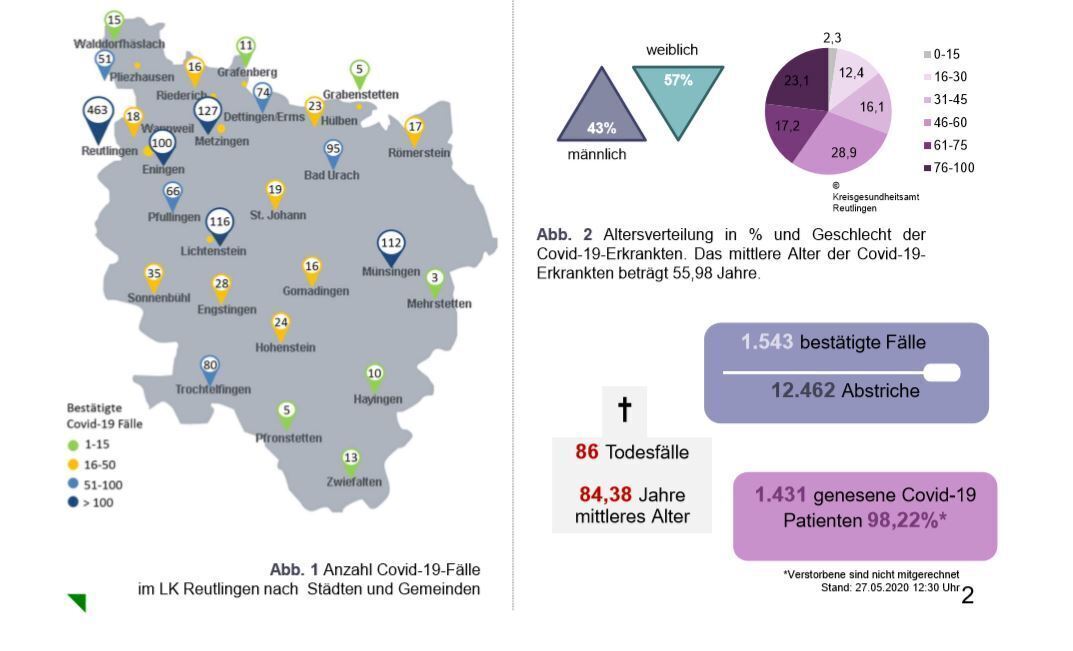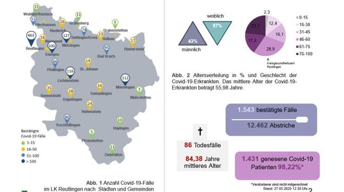 18 Uhr Nun sind auch aktuelle Zahlen aus dem Kreis Tübingen da: Es gibt keinen weiteren bestätigten Corona-Fall aber einen weiteren Todesfall im Zusammenhang mit Covid-19. Insgesamt wurden im Kreis Tübingen also 1.287 Corona-Fälle nachgewiesen, 59 Menschen sind verstorben. Mindestens 1.184 Personen gelten als wieder genesen (Stand Freitag, 22. Mai) - diese Zahl gibt das Landratsamt nur einmal pro Woche raus. (pm)