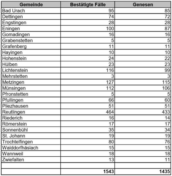 16:39 Uhr Wie gestern meldet der Landkreis Reutlingen für heute keine Neuinfektionen mit dem Coronavirus. Damit bleibt es auch am fünften Tag in Folge bei 1.543 Infizierten. Zu den bereits Genesenen (Stand Freitag: 1.436) und den Toten in Zusammenhang mit Covid-19 (Stand Freitag: 86) gibt die Pressestelle am Wochenende keine Zahlen heraus. (pm)