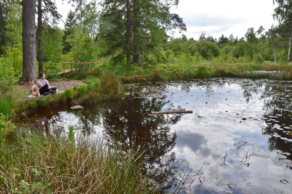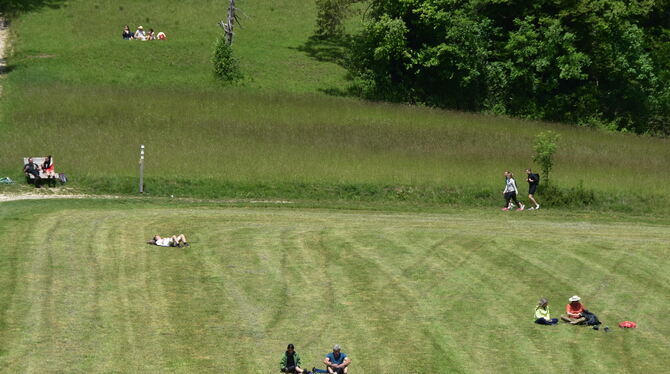 10:37 Uhr Hinaus in die Natur. Mangels Freibad-Liegewiese haben sich diese Sonnenhungrigen in Talheim am Premieumwanderweg Dreifürstensteig bequem gemacht. (mey)
