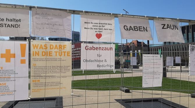 19:00 Uhr Der Gabenzaun am Tübinger Tor am Trampolinplatz ist nun etwas mehr als eine Woche alt – und immer noch wird er regelmäßig bestückt. Initiator des Zauns ist der Reutlinger Hilfsverein »Drei Musketiere«, die Idee kam von Musketiere-Mitglied Steffi Löwl, der Inhaberin vom Vis a Vis. Wer will, kann ein Päckchen aufhängen – am besten mit unverderblichen Lebensmitteln und Hygieneprodukten. Obdachlose, die von der Coronakrise besonders schwer getroffen sind, können sich dann ein Päckchen nehmen. Mittlerweile hängt sogar ein Beutel am Zaun, in dem Pfandflaschen gesammelt werden können, es gibt zudem Tüten mit Äpfeln und Wasserflaschen, auch welche mit Trockenfutter für Tiere. Gefällt uns! (kk)