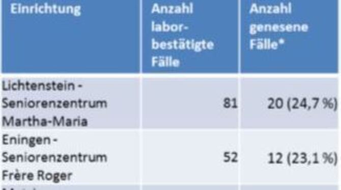 16:35 Uhr Im Kreis Reutlingen wurden Stand jetzt 1.468 Personen positiv auf das Coronavirus getestet, meldet das Landratsamt. Das sind drei mehr als gestern. Davon sind 1.108 bereits wieder genesen. 73 Menschen sind bislang in Zusammenhang mit Covid-19 gestorben. Insgesamt wurden 11.158 Abstriche gemacht, begründete Verdachtsfälle gab es 3.834. (pm)