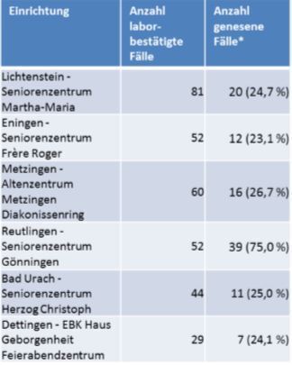 14:00 Uhr Video-Pressekonferenz im Landratsamt Reutlingen zur Situation in den stationären Pflegeeinrichtungen des Kreises. Es geht um die Ergebnisse der flächendeckenden Abstriche. Zunächst aber um die allgemeine Situation im Landkreis: 11.271 Abstriche wurden gemacht, es gibt 1.457 laborbestätigte Corona-Fälle. Das sind 7 mehr als gestern. Insgesamt seien mehr Frauen als Männer betroffen. Inzwischen seien 977 Patienten wieder genesen (31 mehr als gestern), sprich 67 Prozent. Leider sind auch zwei neue Todesfälle - insgesamt 65 - in Zusammenhang mit Covid-19 zu verzeichnen.