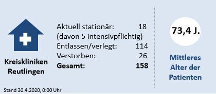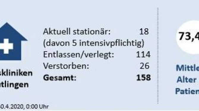 15:18 Uhr Seit Ausbruch der Pandemie wurden an den Reutlinger Kreiskliniken 158 Corona-Patienten behandelt. Aktuell sind es noch 18, fünf davon intensivpflichtig. Verstorben sind währenddessen 26, das mittlere Alter aller an den Kreiskliniken versorgten Covid-19-Patienten beträgt 73,4 Jahre. (GEA)