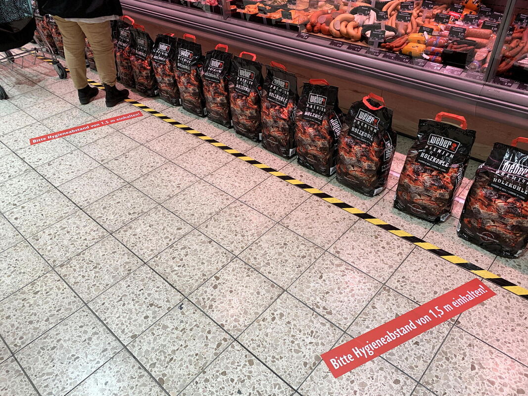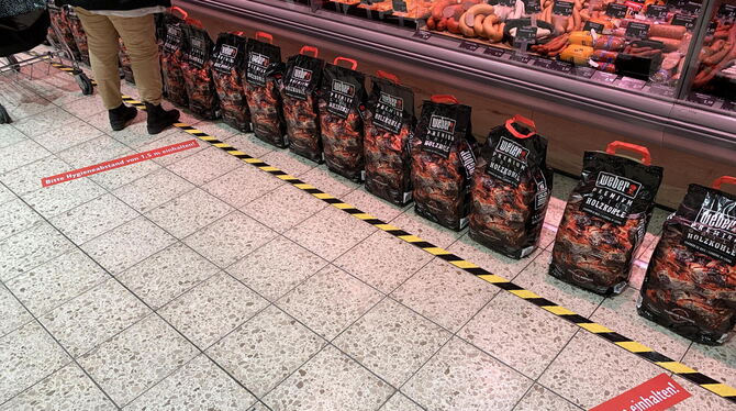 16:00 Uhr Kohle in Zeiten von Corona: Ein Supermarkt aus der Region verbindet Trennendes mit zur Jahreszeit passenden Angeboten. Statt nur einer Trennlinie auf dem Boden haben die Verkäufer Säcke mit Holzkohle zum Grillen vor der Metzgertheke aufgestellt. (zen)