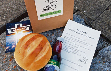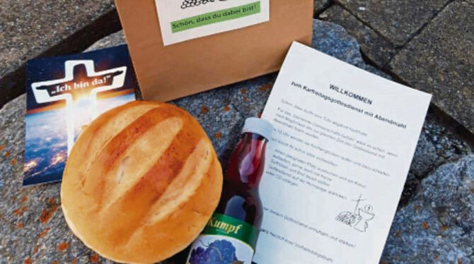 Den ganzen Tag über bestand die Möglichkeit, sich am Gemeindehaus in Meidelstetten und an der Kirche in Bernloch vorbereitete »Abendmahltüten« mit eigens vom Bäcker gebackenem Brot, mit Traubensaft sowie einer Karte, die zu einem Kreuz gefaltet werden konnte, abzuholen. 120 Tüten wurden abgepackt und von den Gläubigen auch abgeholt. »Wir wollten, dass sich die Gemeinde nicht ganz verliert, sondern im Gemeinschaftsgefühl und im Glauben zueinanderfindet«, sagt Alexandra Steinhart. (in)