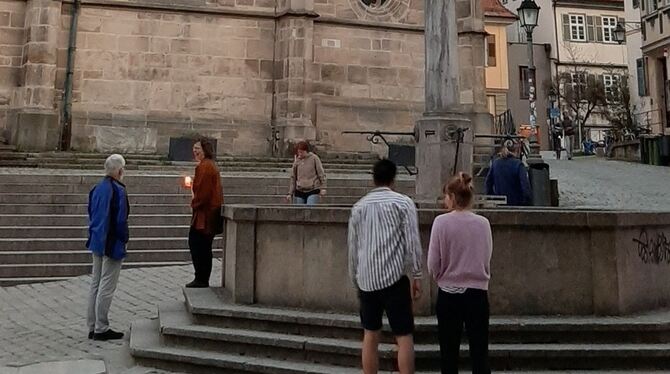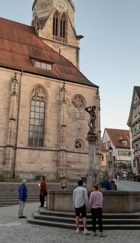 21:00 Uhr Wir beenden diesen Tag mit einem berührenden Moment auf dem Tübinger Holzmarkt: Weil die Motette samstags in der Stiftskirche nichts mehr stattfinden darf, spielen die Musiker bis auf weiteres vom Turm der Kirche. Den Anfang, direkt nach dem 8-Uhr-Läuten, machte heute das Familienquartett Nonnenmann mit Bach-Chorälen. Obwohl die Veranstalter in ihren Ankündigungen darum gebeten hatten, nicht zur Stiftskirche zu kommen, versammelten sich rund 40 Menschen auf dem Holzmarkt und in den angrenzenden Gassen, um den Klängen zu lauschen. Ausnahmslos alle hielten sich an die Corona-Regeln: Sie waren höchstens zu zweit unterwegs und hielten gebührend Abstand zueinander. Die Musiker spielten einmal in alle Himmelsrichtungen, währendessen ging die Sonne unter. Am Ende, nach 20 Minuten, herrschte kurz andächtige Stille, dann applaudierten die Zuhörer. (kk)