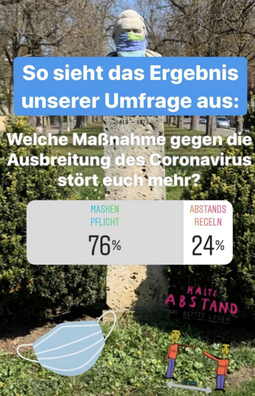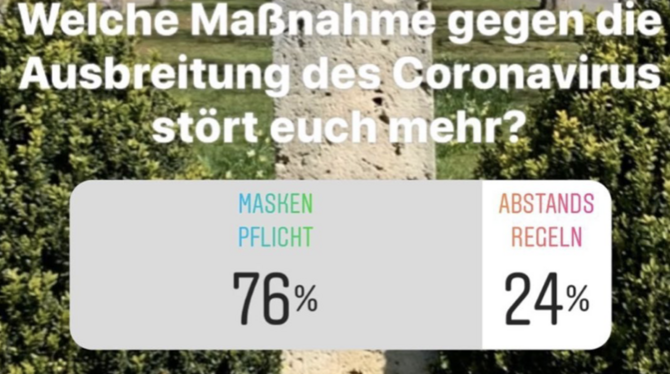8:25 Uhr Nach und nach lockern Bundes- und Landesregierung die Maßnahmen zur Eindämmung der Corona-Pandemie. Maskenpflicht und Abstandsregeln sind jedoch noch immer präsent. Auf dem GEA-Instagram-Kanal haben wir gefragt, welche Maßnahme die User mehr stört. Das Ergebnis: 76 Prozent wählten die Maskenpflicht, die restlichen 24 Prozent die Abstandsregeln. Auch auf gea.de haben wir die Leser abstimmen lassen. Hier entschieden sich 38 Prozent für die Maskenpflicht und 4 Prozent für die Abstandsregeln. Die Mehrheit (58 Prozent) stimmte für Antwort drei: Mich stören die Einschränkungen nicht (Das Umfrage-Tool auf Instagram lässt keine drei Antwortenmöglichkeiten zu). (ege)