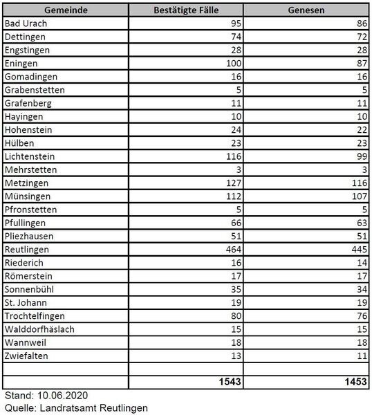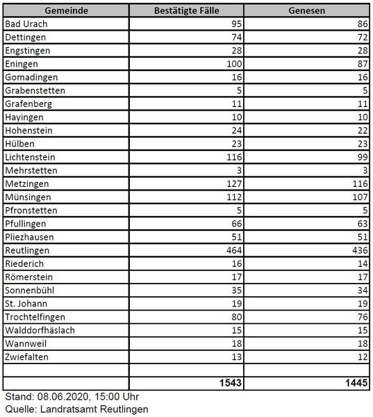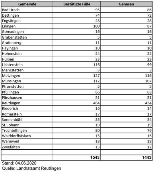 13:37 Uhr Je kürzer die Meldung aus dem Landratsamt Reutlingen, umso erfreulicher: Es gibt im Landkreis Reutlingen 1.543 bestätigte Covid-19-Fälle. So wie seit Tagen keine neuen Fälle. (pm)