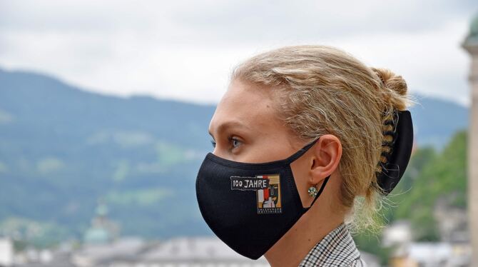 Eine Besucherin bei den Salzburger_Festspielen 2020 mit Maske im Jubiläums-Look.