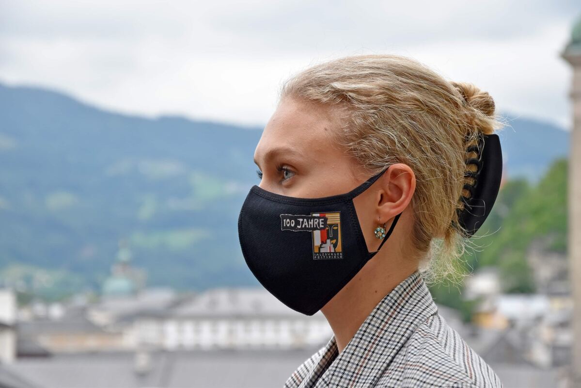 Eine Besucherin bei den Salzburger_Festspielen 2020 mit Maske im Jubiläums-Look. Foto: SF/Anne Zeuner