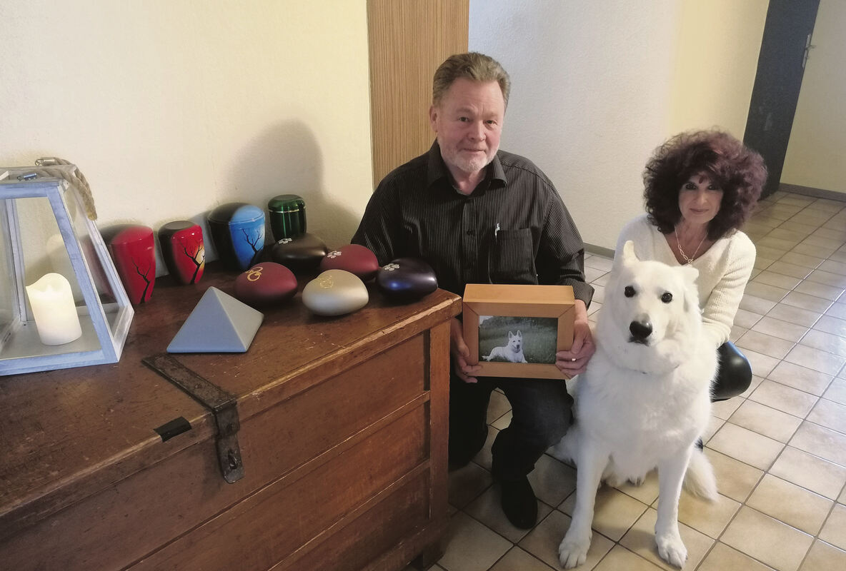 Hans-Joachim Flemming und seine Frau Birgit vermitteln im Kreis Tübingen Tierkremationen. Immer mit dabei ist der elfjährige Schäferhund Yuma. Er wirkt beruhigend auf die trauernden Besucher, weiß Hans-Joachim Flemming.