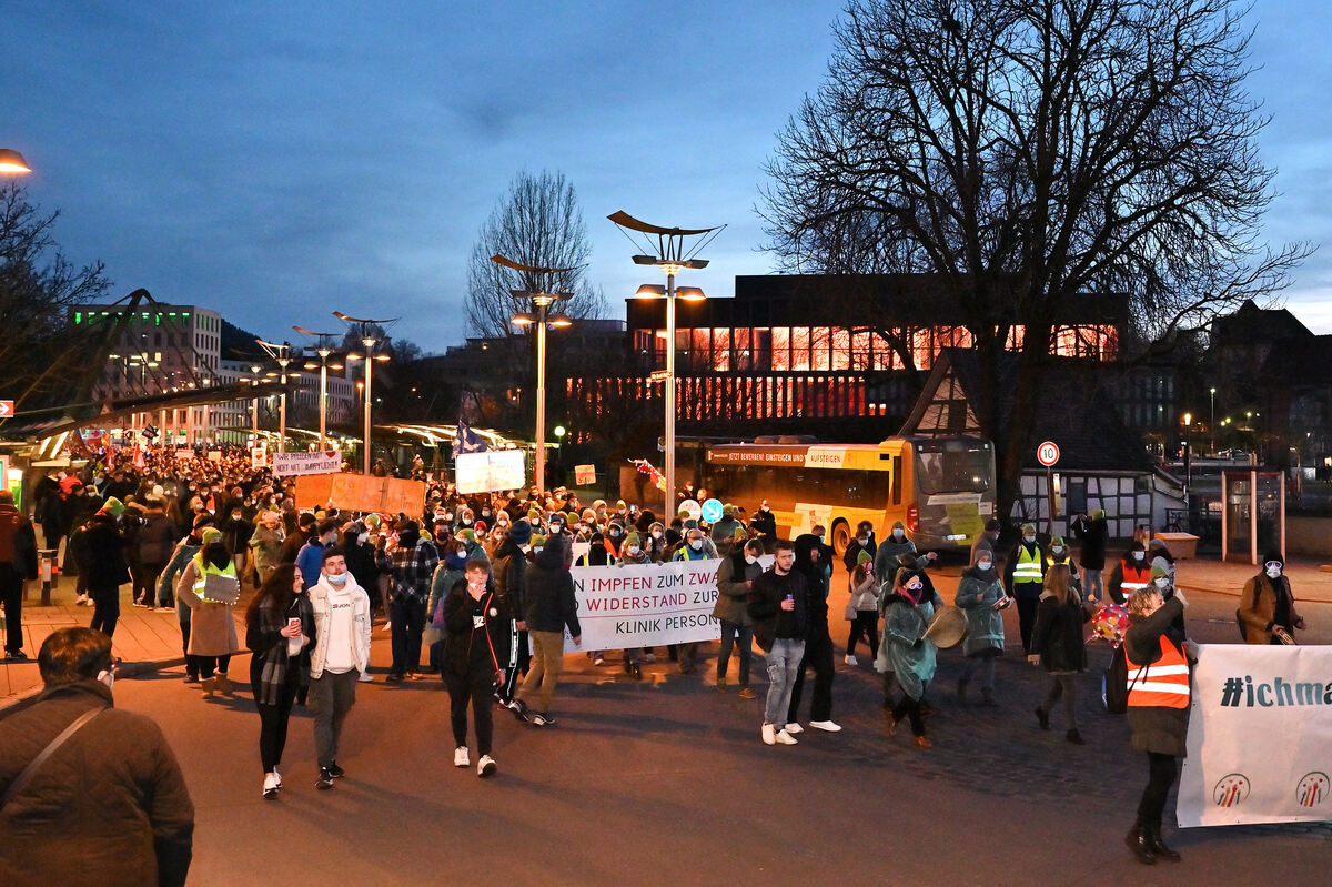 An der Spitze der Menschenmenge stand auf einem mehrere Meter breiten Banner: »Klinikpersonal steht auf. Wenn Impfen zum Zwang wird, wird Widerstand zur Pflicht.« Diesen Protesten schlossen sich viele Teilnehmer an. Ausgestattet mit Plakaten, auf denen Herzsymbole zu sehen waren, stand geschrieben: »Wir pflegen mit Herz, nicht mit Impfpflicht«, oder »Letztes Jahr gefeiert, heute gefeuert.«