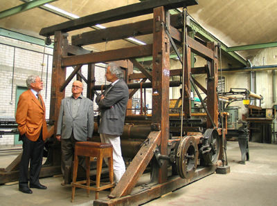 Aus mächtigen Balken gezimmert ist diese Handwebmaschine für Siebtücher aus Draht, Mitte bis Ende des 19. Jahrhunderts im Einsatz. Davor (von links) Hans Kurtz, bis 1993 Leiter des Unternehmens Hermann Wangner, sein langjähriger Mitarbeiter Gerhard Arnold und Dr. Werner Ströbele, Leiter des Reutlinger Kulturamtes und Heimatmuseums mit seinem Industriemagazin.