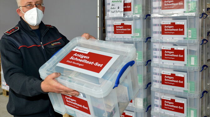 In diesen Plastikboxen ist eine Auswahl verschiedener Schnelltests für die Stadt Reutlingen zusammengestellt. Feuerwehrmann Rainer Koch greift sie vom großen Stapel.