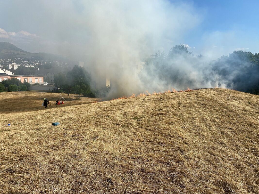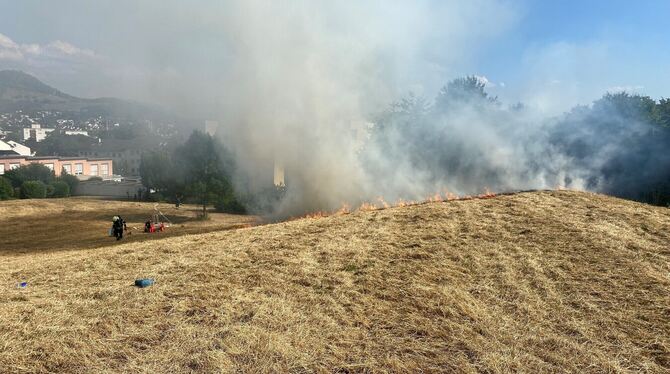 Die Brandursache ist ungeklärt, die Wiese war aber wegen der hohen Temperaturen stark ausgetrocknet und kurz zuvor frisch gemäht worden. Die Feuerwehr blieb nach dem Einsatz für Nachlöscharbeiten vor Ort. (GEA)