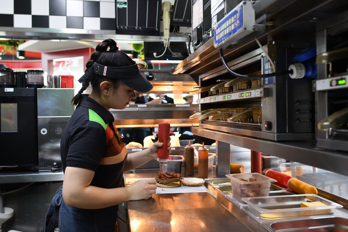 Die Frauen und Männer bereiten unter der Leitung von Restaurantmanager Damir Mujdzic in der Küche jeden Burger genau nach den Vorschriften von Burger King zu. Dabei kommen viele Maschinen am »Burger Board« zum Einsatz. Zunächst wird ein bereits geteiltes weiches Brötchen, das Bun, getrennt in seine Hälften in den Toaster gesteckt. Unten fallen die Backwaren hübsch heiß raus, kommen mit einem geübten Handgriff aufs Verpackungspapier. Die weiteren Zutaten stehen in Kunststoffschalen in Reih und Glied bereit. Die Oberseite wird in die Hand genommen, mit Mayonaise bestrichen sowie mit Eisbergsalat bestreut. Zwei Tomatenscheiben runden seine Bearbeitung ab. Jetzt geht's mit der Unterseite des Buns weiter.