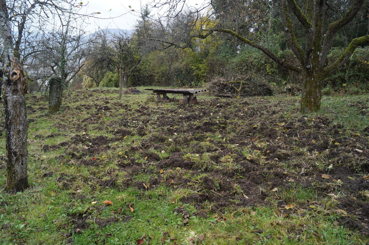 Auch Dieter Mutschler hatte nächtlichen Besuch von wahrscheinlich fünf bis sechs Überläufern, halbstarken Keilern in der Gewichtsklasse bis 40 Kilogramm. Tagsüber stecken sie wahrscheinlich in den zahlreichen verwilderten Parzellen am Monte Schorsch. In den Brombeerverhauen fühlen sie sich wohl und sicher. (GEA)