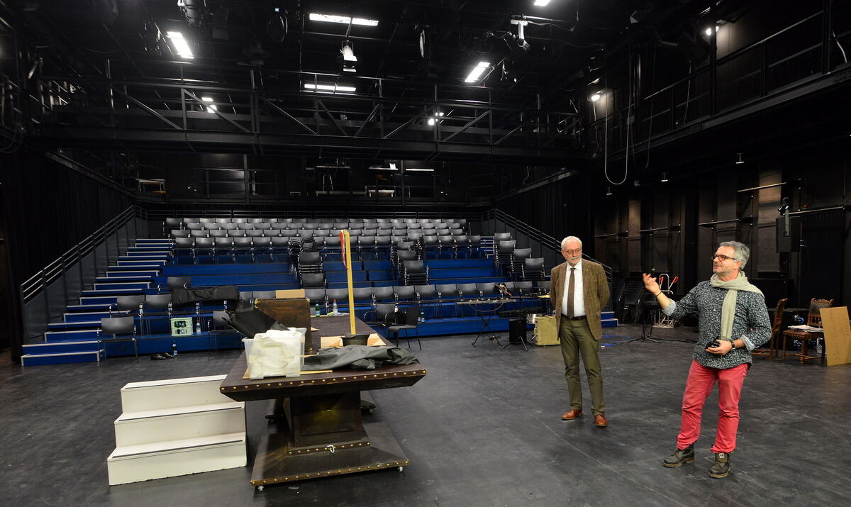 »Tonne 1« heißt künftig der große, bis zu 200 Zuschauer fassende Saal im Theater-Neubau, wo jetzt schon Probebetrieb herrscht. Tonne-Intendant Enrico Urbanek (rechts) und Thomas Lambeck, Vorsitzender des Theatervereins, freuen sich auf die Eröffnung nächsten Freitag samt anschließenden »Tagen der offenen Tür«. FOTO: NIETHAMMER