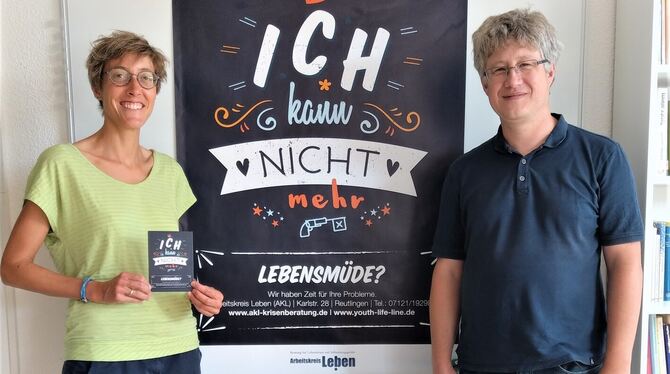 REUTLINGEN. Die Plakate des Arbeitskreises Leben (AKL) sind markant. Ihr schwarzer Hintergrund und der Satz »Ich kann nicht mehr« stehen für Trauer und Verzweiflung, in der ein Mensch gefangen sein kann. Doch bunte Farben machen Hoffnung. Zum ersten Mal macht der AKL am Welttag der Suizidprävention, dem 10. September, mit Plakaten und Postkarten auf sich aufmerksam. Die Veranstaltung wurde 2003 von der Weltgesundheitsorganisation (WHO) und der International Association for Suicide Prevention (IASP) initiiert.