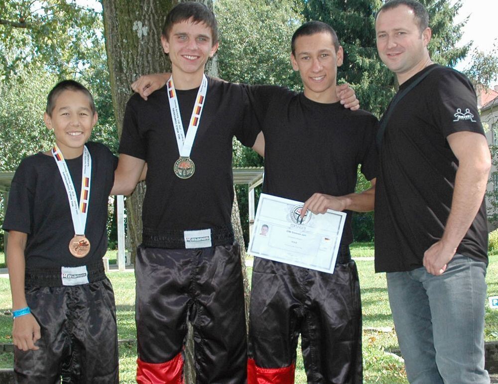 Die WM-Teilnehmer mit ihrem Trainer (von links): Timur Landmann, Roman Simnizki, Konstantin Kozajlidi und Alexej Jaschenko. FOTO: PR