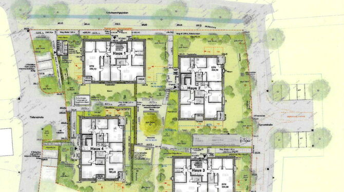 Auf dem 3.800 Quadratmeter großen Grundstück am Ortsrand von Sickenhausen entstehen vier Mehrfamilienhäuser mit 28 Wohnungen.