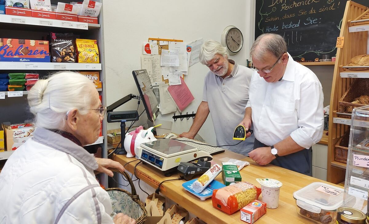 Oberbürgermeister Thomas Keck (rechts) hinter der Verkaufstheke des Reichenecker Dorfladens: Sein Einsatz sorgte jüngst für ein sattes Tagesumsatzplus.