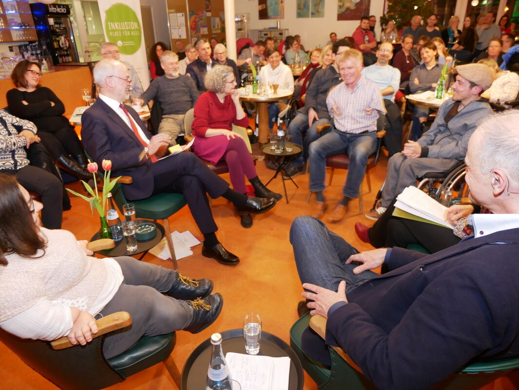 In einem anderen Format präsentierte sich die Reutlinger Inklusionskonferenz mit den Gesprächsgästen (von links) Andrea Schöne, Landrat Thomas Reumann, Professor Elizabeth Wheeler, Mattias Berg, Tobias Binder und Thomas Poreski. FOTO: LEISTER