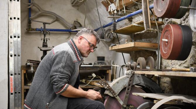 Das wird scharf: Michael Wurster im Keller seines Reutlinger Geschäftes mit dem Traditionsnamen Gottlob Brucklacher beim Schleifen eines Messers.