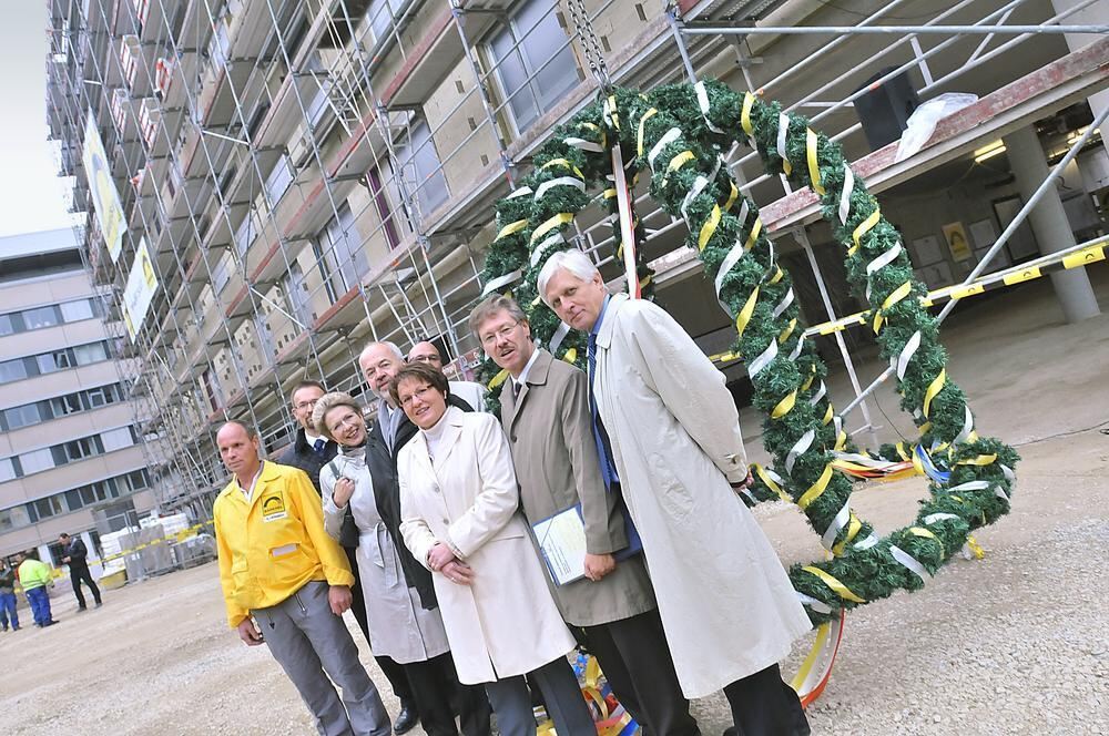 Posieren mit der Richtfestkrone (von links): Georg Heimisch, Bernhard Saur, Landrat Thomas Reumann, Privatdozent Dr. Peter Kristen, Staatssekretär Dieter Hillebrand und Professor Rudolf Schmid mit Oberbürgermeisterin Barbara Bosch und Dr. Rafaela Korte.