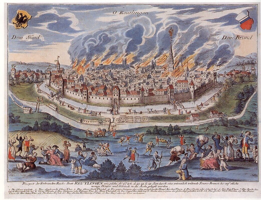 REUTLINGEN. Die Themen-Führung »Der große Brand von Reutlingen« am Samstag, 23. September, 16 Uhr, beleuchtet den Stadtbrand vom 23. September 1726 als spätabends im Haus des Schusters Dürr ein Feuer ausbrach. Zu diesem Zeitpunkt konnte die Reutlinger Bürgerschaft noch nicht ahnen, dass dies der Beginn der größten Katastrophe war, von der Reutlingen bis dahin heimgesucht wurde. Vier Fünftel der Stadt fielen dem Brand zum Opfer: Fast 900 Wohnhäuser und nahezu alle öffentlichen Gebäude wurden zerstört, 1.200 Familien wurden obdachlos.