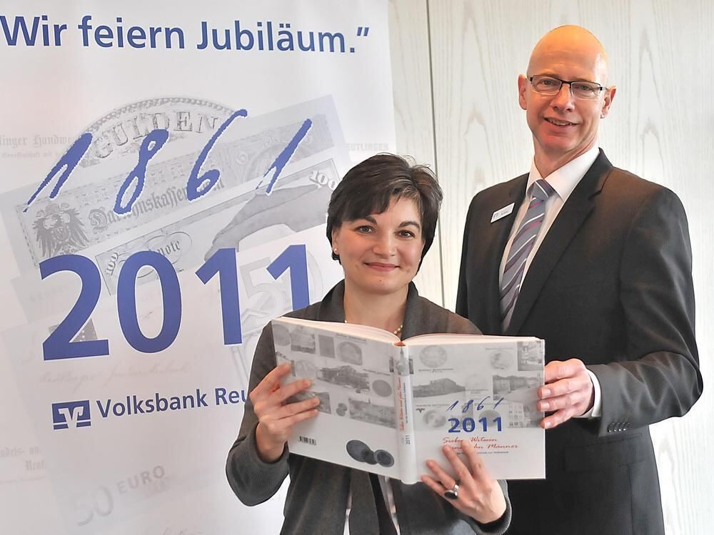Stolz auf die gebundene Bank-Geschichte: Autorin Andrea Anstädt und Volksbank-Vorstandsmitglied Siegfried Arnold.