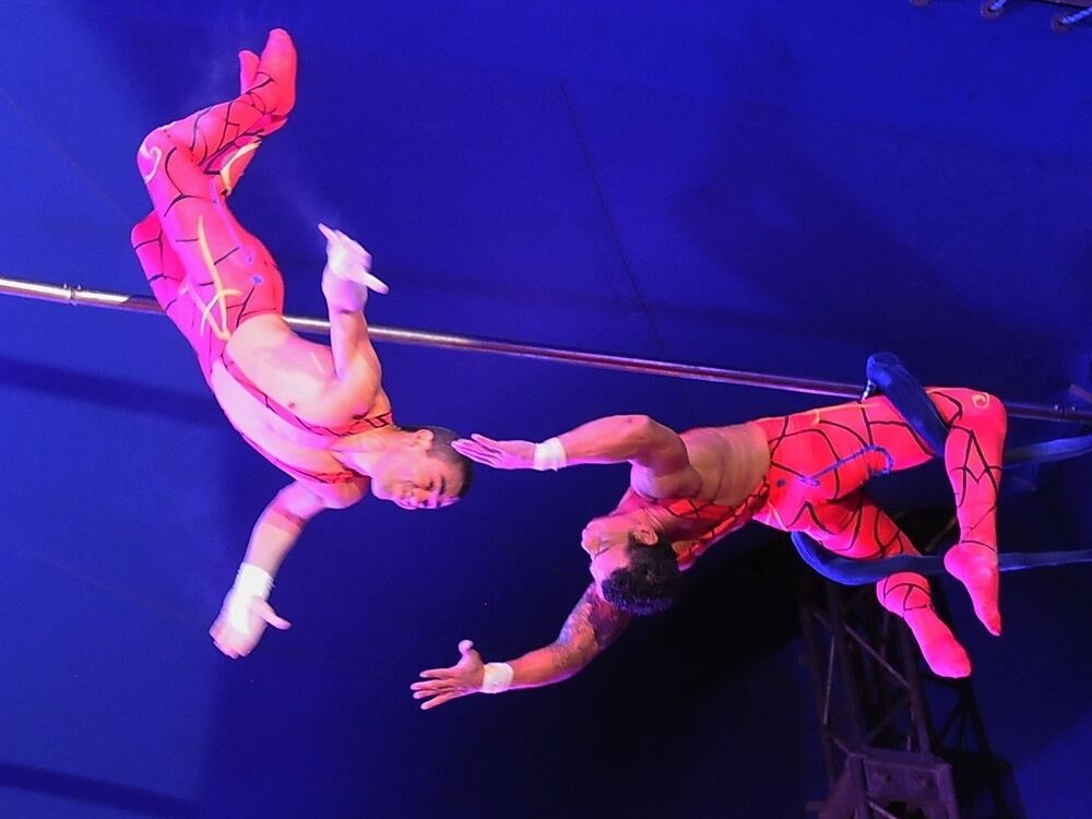 Tempogeladene Flugtrapez-Artistik unter der Zirkuskuppel.