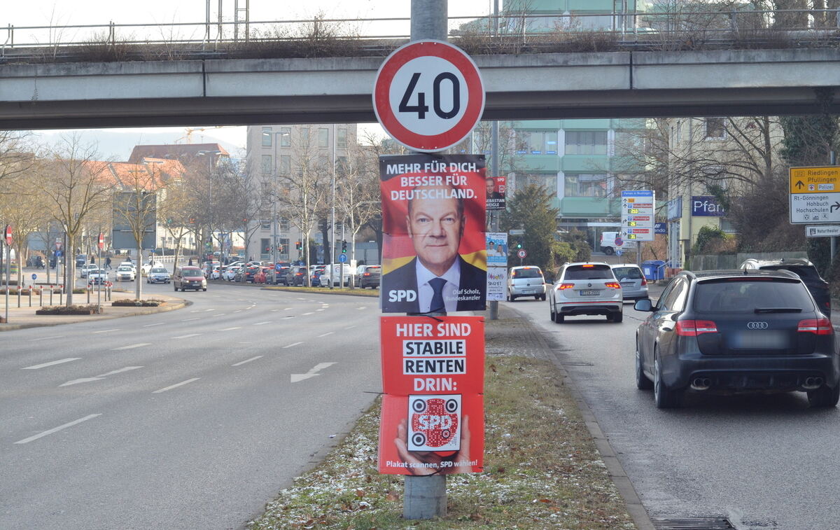 Die SPD habe massenhaft Plakate »widerrechtlich« aufgehängt, schreibt die CDU in einem offenen Brief an OB Thomas Keck. Wie hier an der Stadthalle unter einem Tempo-40-Schild.