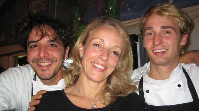 Gammertinger Connection aktuell im Reutlinger Weindorf: Matze Wiech, links, Katrin Baur vom »Forelle«-Clan und Cousin Clemens Burkarth, der zurzeit im besten Wiener Restaurant, im »Steirereck«, seine Kochausbildung macht.