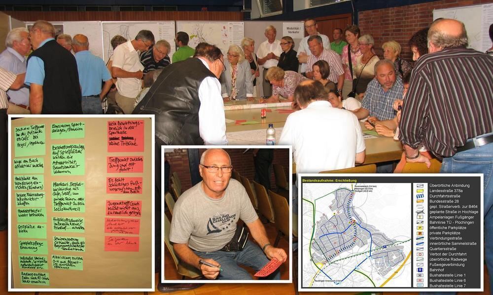 Anhand der Bestandsanalyse des Planungsbüros entwickelten die Sondelfinger ihr Dorf der Zukunft. Die Ergebnisse wurden auf bunten Zetteln notiert, so auch von Josef Duma (unten Mitte), der seit 20 Jahren an der Reutlinger Straße wohnt.