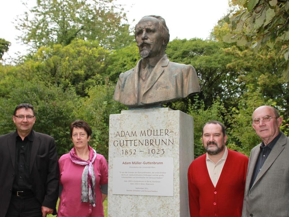 Werner Rumpel, Katharina Ortinau, Norbert Merkle und Nikolaus Fuhry umrahmen das Denkmal von Adam Müller-Guttenbrunn.