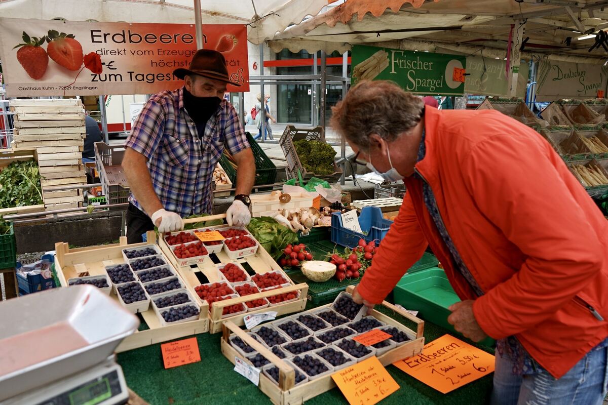 Am Stand von Frank Kuhn locken jetzt aromatische Heidelbeeren. Kunde Ulli Koebe greift da gerne zu. FOTO: LEIPOLD