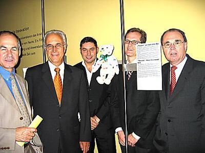 Limitierter schwäbischer Beitrag für die Ausstellung »Textiles St. Gallen« in Berlin: ein bestickter Steiff-Teddy, präsentiert bei der Eröffnung mit dem baden-württembergischen Minister Rudolf Köberle, dem St. Galler Regierungspräsidenten Josef Keller, den Ausstellungsmachern Veit Rausch und Cornel Dora und Botschafter Werner Baumann (von links).