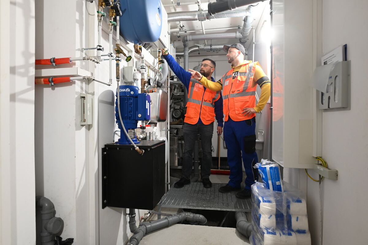 Burcin Güner (links) und Daniel Lehr, die beiden Leiter der Stadtreinigung bei den Technischen Betriebsdiensten Reutlingen, im Technikraum der Toilettenanlage Pomologie.