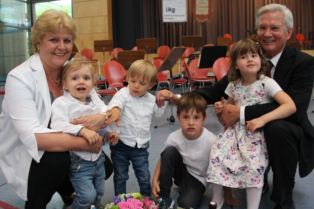 Der langjährige Direktor des Isolde-Kurz-Gymnasiums, Martin Englert (im Bild ganz familiär mit Enkeln und Ehefrau Beate), wurde in den Ruhestand verabschiedet.