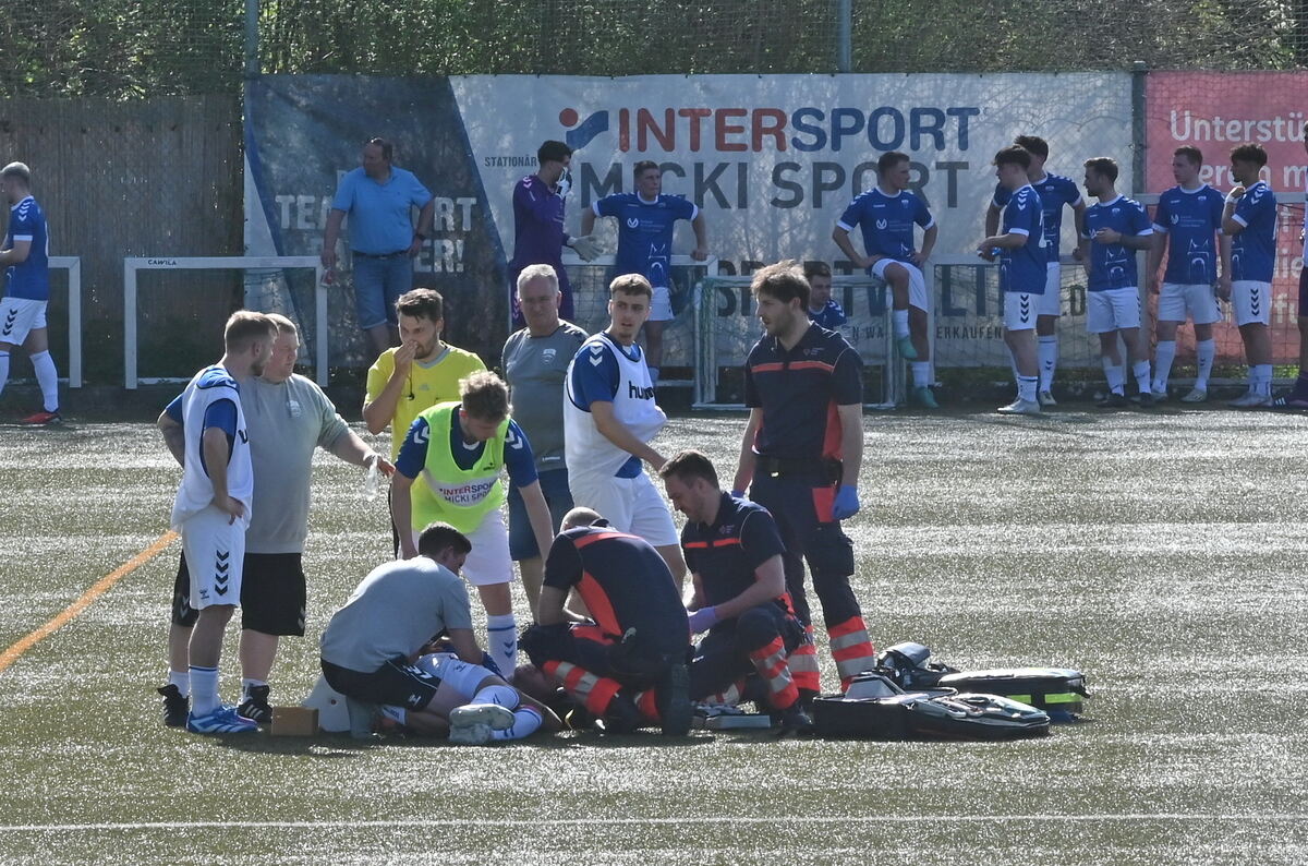 Sanitäter und Notarzt auf dem Spielfeld versorgen den am Ellbogen verletzten Pfullinger Verteidiger Sven Packert.